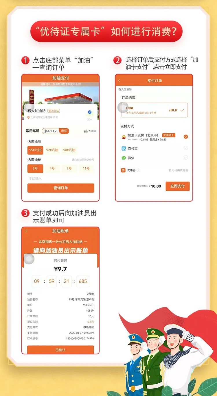 1.为持优待证的退役军人和烈士遗属、因公牺牲军人遗属、病故军人遗属日常生活所需的机动车,成功注册中国石油电子卡,并成功绑定优待证,持优待证专属卡加汽油(92号、95号、98号)提供“每周首单优惠”,即持证人每周在中国石油所属自营加油站加注的第一单汽油时享受97折优惠。